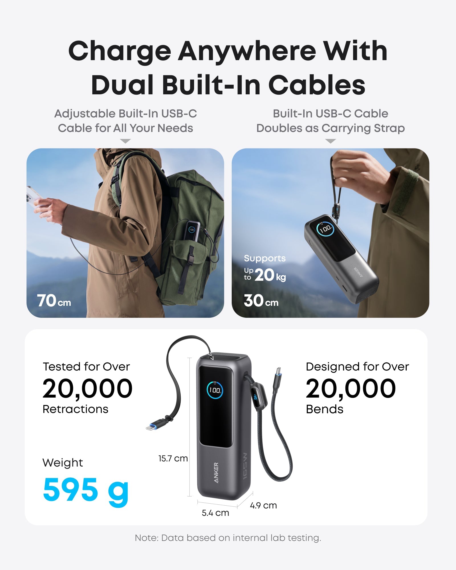 Featuring dual built-in USB-C cables (one retractable and one fixed) along with additional USB-C and USB-A ports, this power bank enables multi-device charging, letting you power up to four devices at once — perfect for travel, work, or everyday use.