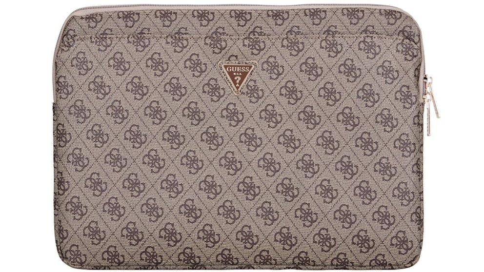 Carry your laptop with ultimate sophistication and practicality. This Guess 14-inch sleeve features a signature 4G monogram design, a functional front zipper pocket, and the iconic Triangle logo, available in black, brown, and pink.
