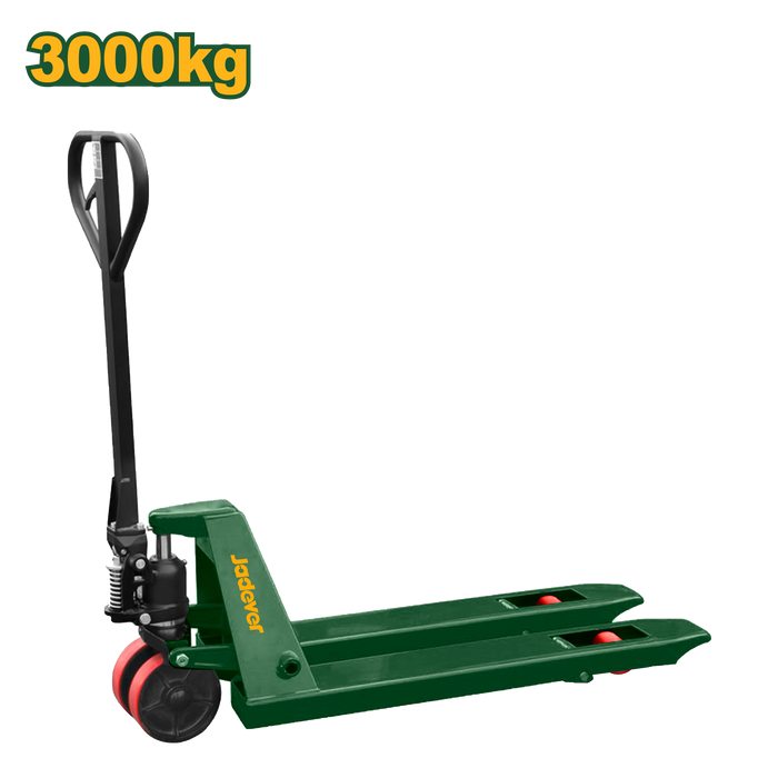 The Jadever JDNH1R30 is a robust hand pallet truck with a 3‑ton (3000 kg) load capacity, ideal for industrial, warehouse, or logistics applications in Jordan. It features long forks sized 550 × 1150 mm, adjustable fork height from 85 mm to 200 mm, and smooth PU wheels for durability and easy manoeuvring