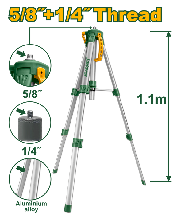 A sturdy aluminum tripod stand compatible with Jadever laser level models. Adjustable height from 0.45 m to 1.1 m, featuring universal adapter screws (5/8″ & 1/4″ threads). Ideal for stable mounting of laser leveling tools in construction and interior alignment tasks. Light, portable, and packed in a color box.
