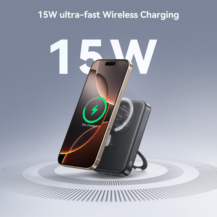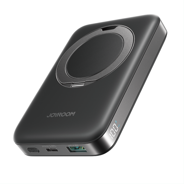 The Joyroom JR-PBM12 is a 10,000mAh magnetic wireless power bank featuring 22.5W wired fast charging and a built-in ring holder for enhanced grip and viewing.