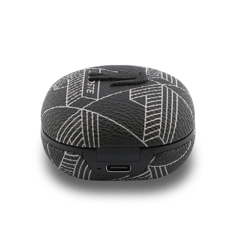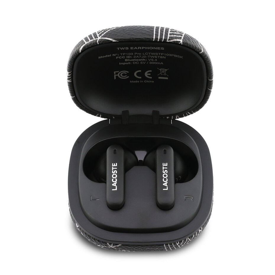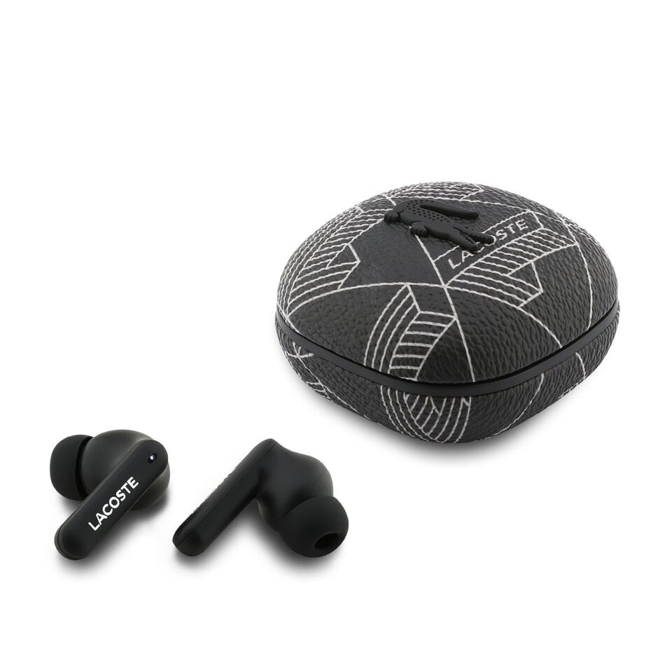 For those who prioritize clear communication, the integrated **Environmental Noise Cancellation (ENC)** ensures your voice is heard crystal clear during calls by filtering out background chatter and wind noise. The sleek black charging case, adorned with the iconic Lacoste crocodile logo, provides a sophisticated look while offering extended battery life for all-day use.