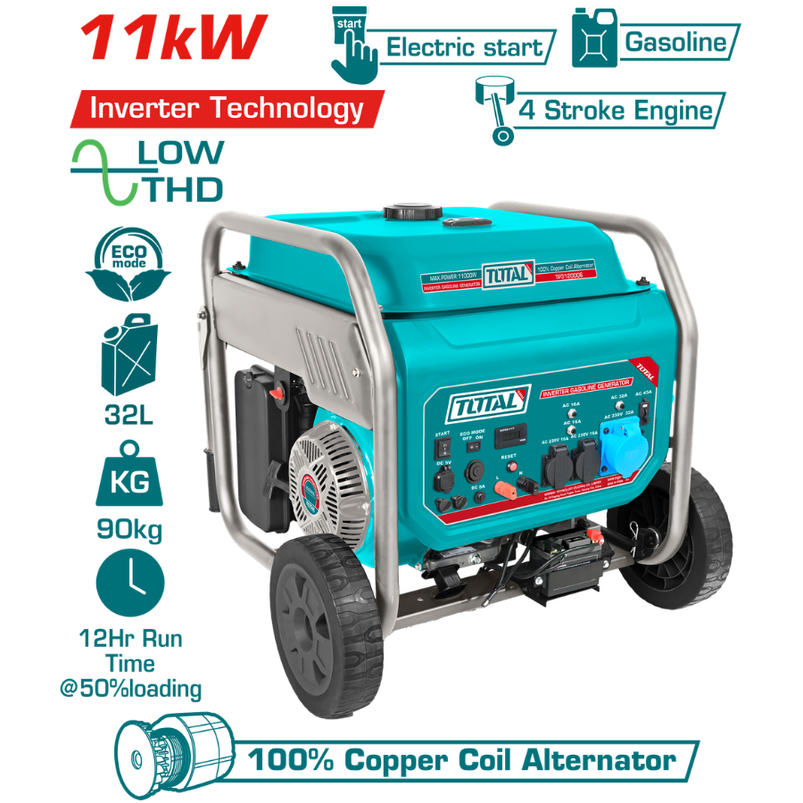 The Total TP3120006 stands out with a maximum output of 11.0kW and a rated output of 10.0kW. Thanks to its Inverter technology, it produces a clean current (fluctuation ±3%) that is safe for laptops, servers, and medical devices that traditional generators might damage.