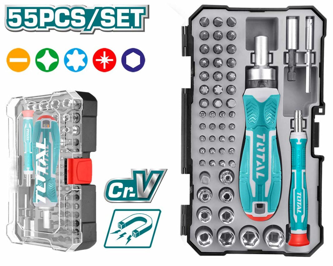 Title in Arabic: طقم مفك مع راسيات 55 قطعة Total TACSD30556