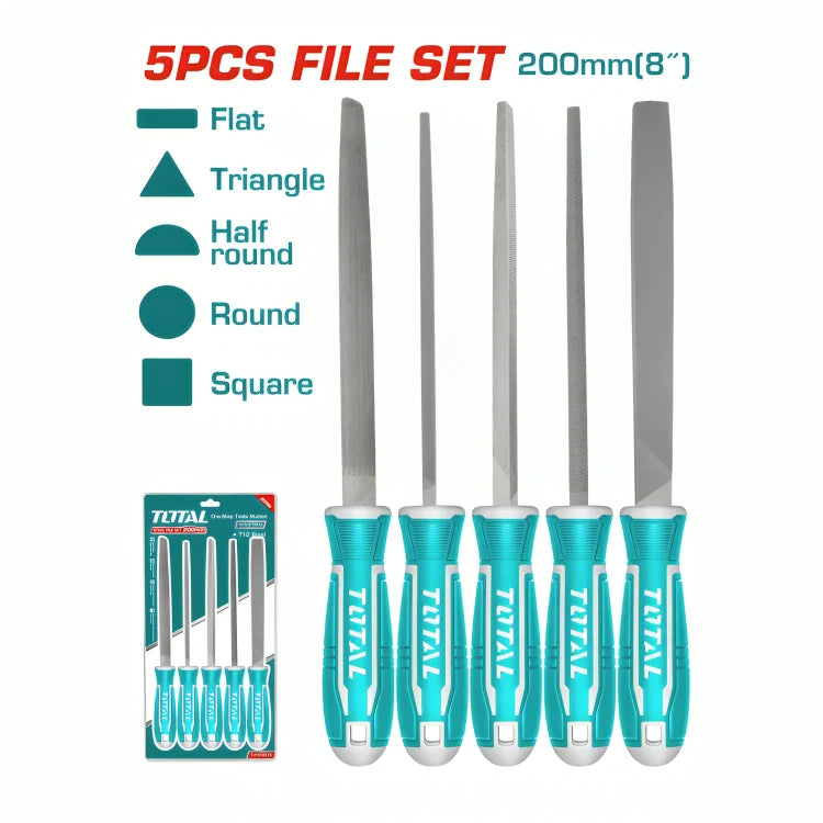 The TOTAL THT918516 Steel File Set includes 5 different 8-inch files designed to meet a wide range of shaping and smoothing needs. The set features various shapes (flat, half round, round, triangular, and knife) to handle different surfaces and contours on wood, metal, and plastic. Made of high-quality carbon steel and equipped with ergonomic, non-slip handles, this set is ideal for carpenters, craftsmen, and workshop professionals.