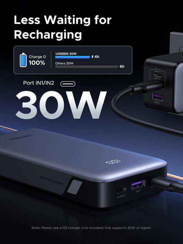 Experience reliable and intelligent power with the UGREEN Nexode 30W Power Bank. Featuring a substantial 20,000mAh capacity, this portable charger ensures your devices stay powered for days. The 30W Power Delivery (PD) output is capable of fast-charging an iPhone 15 to 60% in just 30 minutes, and it provides enough wattage to sustain tablets and MacBook Air models.