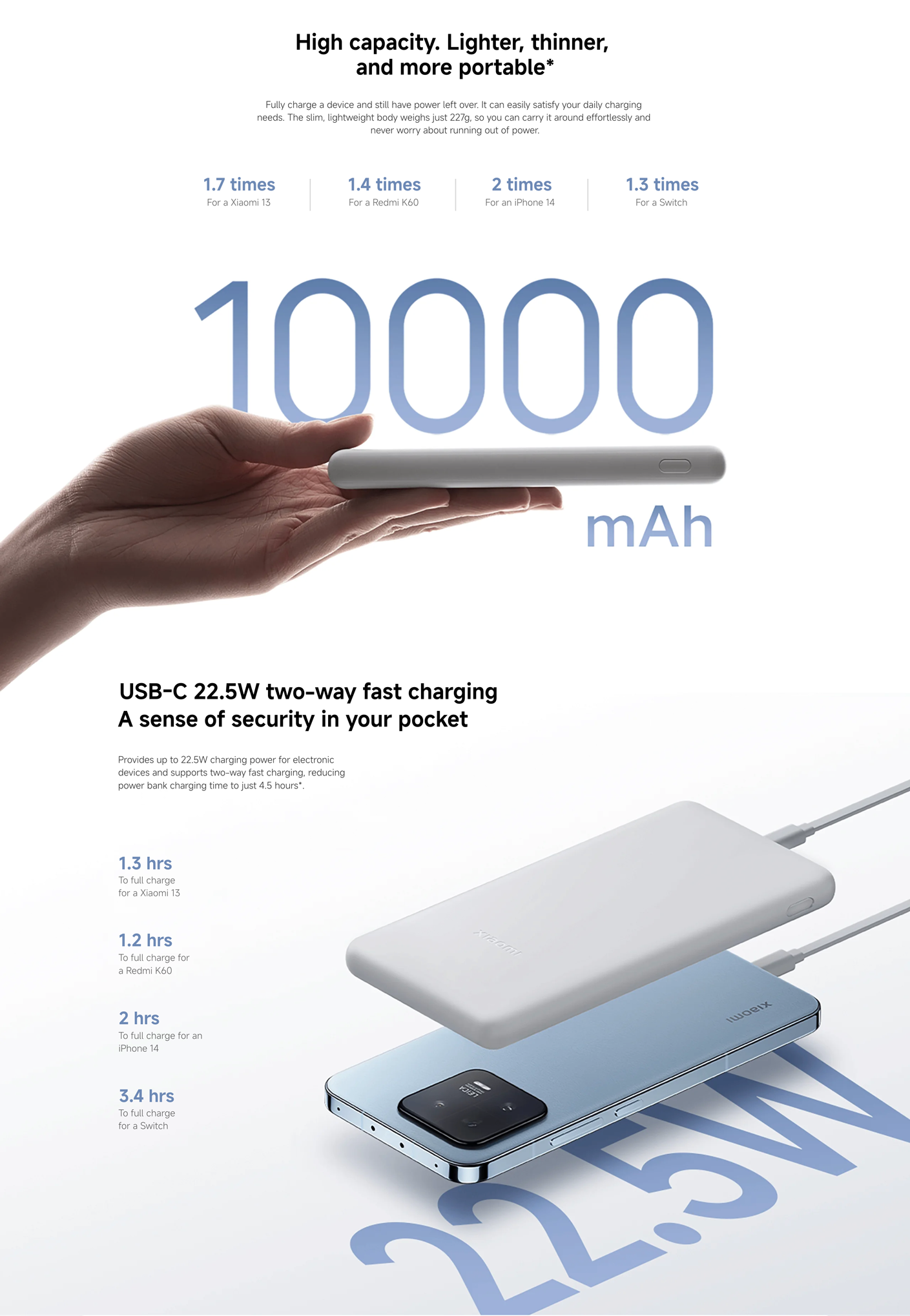 A lightweight 10000mAh power bank with up to 22W fast charging, designed for convenient everyday use.