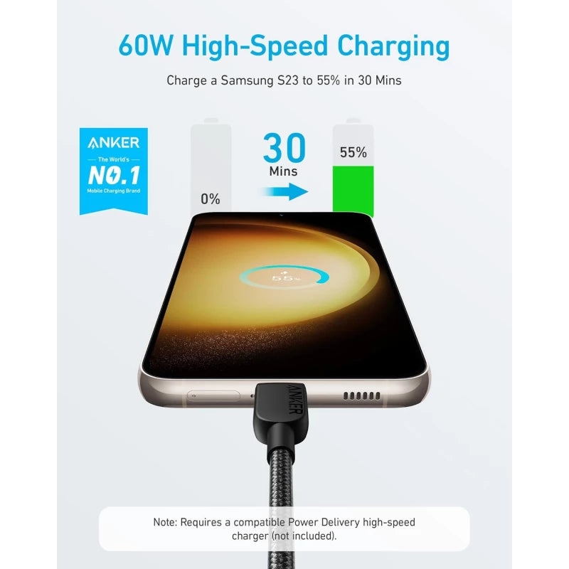 كابل USB-C إلى USB-C من Anker يدعم شحن سريع 60W ونقل بيانات، متوفر بأطوال 3 قدم