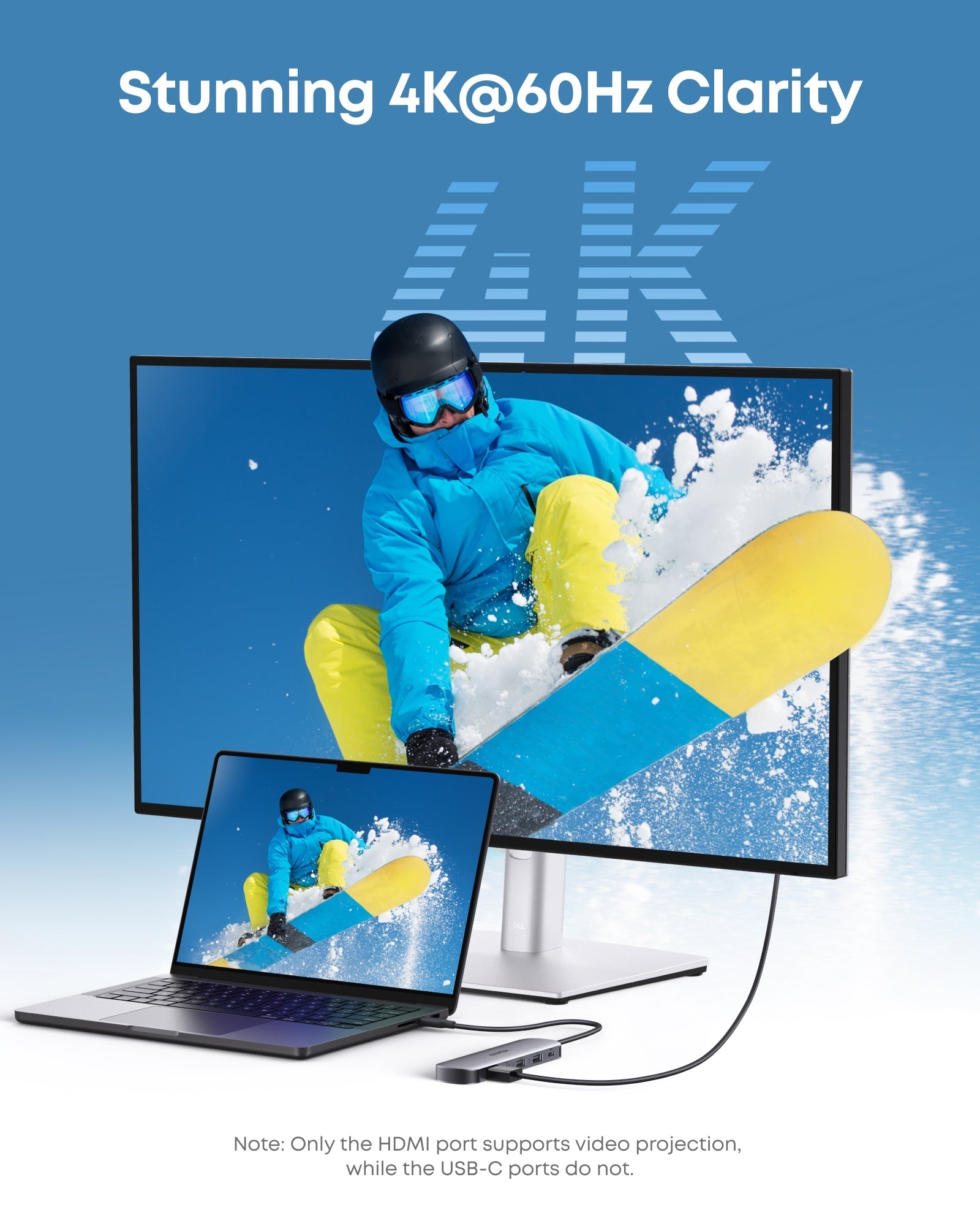 بفضل منفذ HDMI الذي يدعم دقة 4K@60Hz، يمكنك عرض محتوى عالي الجودة على الشاشات الكبيرة سواء للعروض، الفيديو أو العمل الإبداعي. كما توفر منافذ USB-A 3.0 ومنفذ USB-C 3.0 سرعات نقل بيانات تصل حتى 5 Gbps.