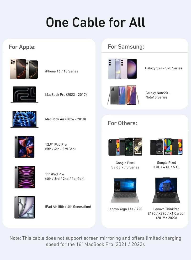 بطول مناسب للاستخدام اليومي، يشمل هذا الكابل وصلات معززة وغلاف قوي لتحمّل الانحناءات والتآكل، مما يجعله مناسبًا للاستخدام في المنزل، المكتب أو أثناء السفر.