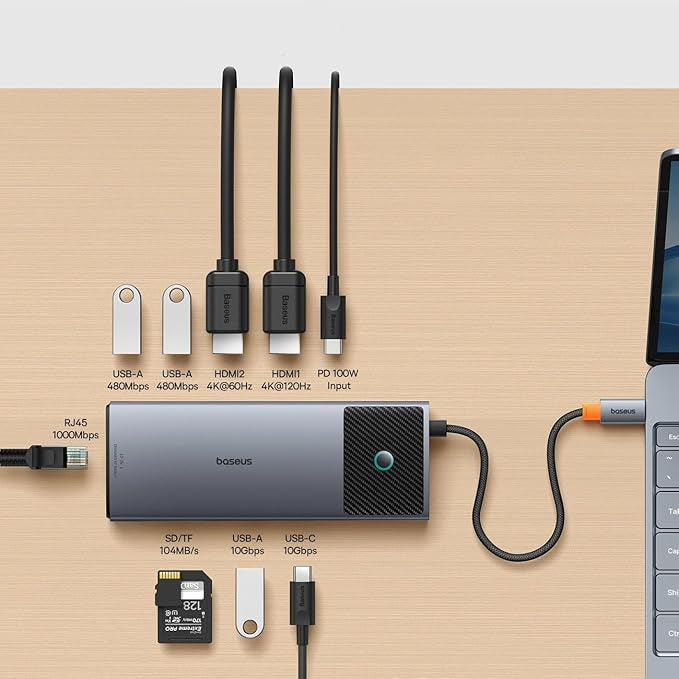 يعد موزع Baseus UltraJoy 10-in-1 حلاً شاملاً للاتصال مصمماً لتوسيع قدرات جهاز اللابتوب الخاص بك. بفضل تصميمه الفاخر من الألومنيوم وعشرة منافذ متنوعة، فإنه يحول منفذ USB-C واحداً إلى محطة عمل كاملة للاستخدام المهني والإبداعي.