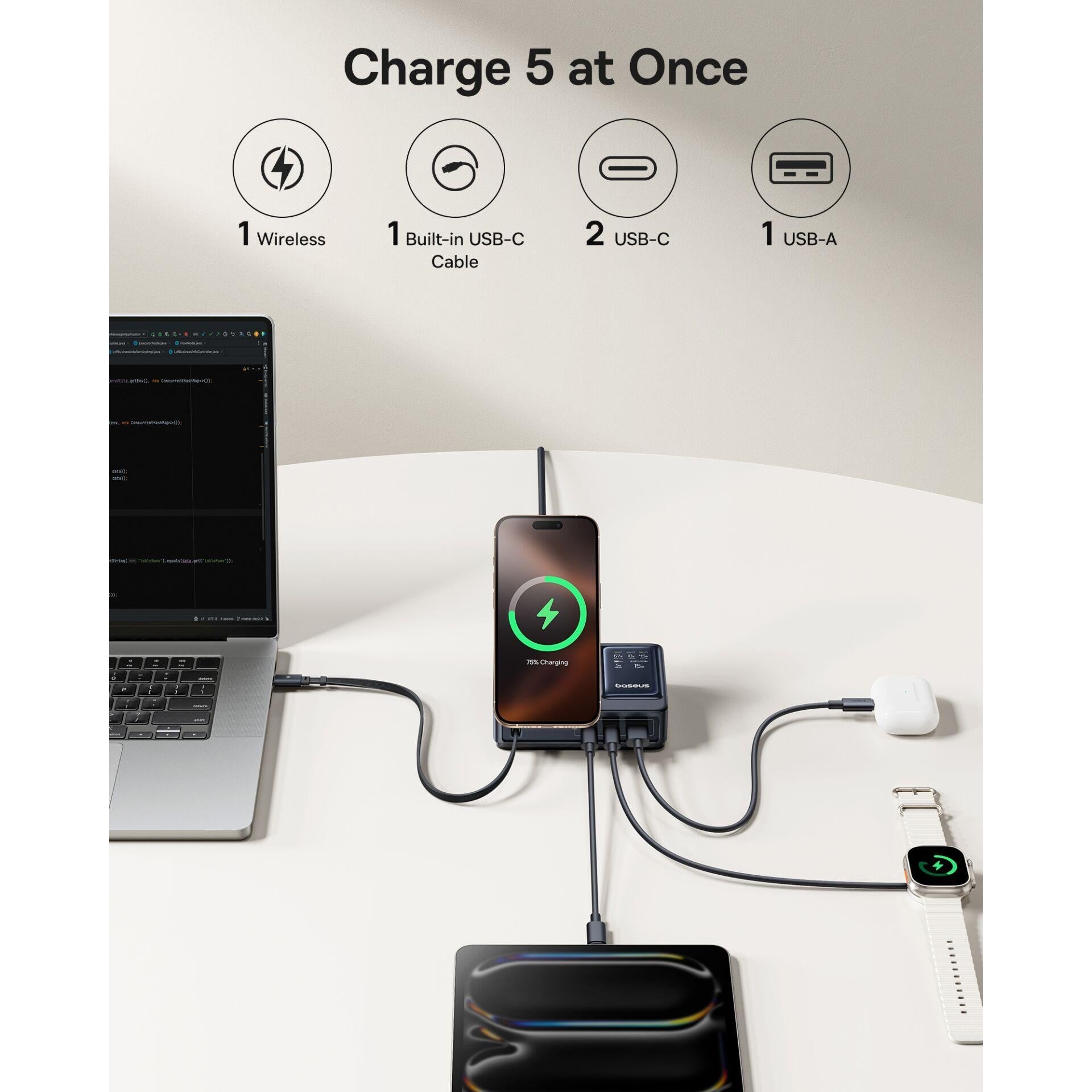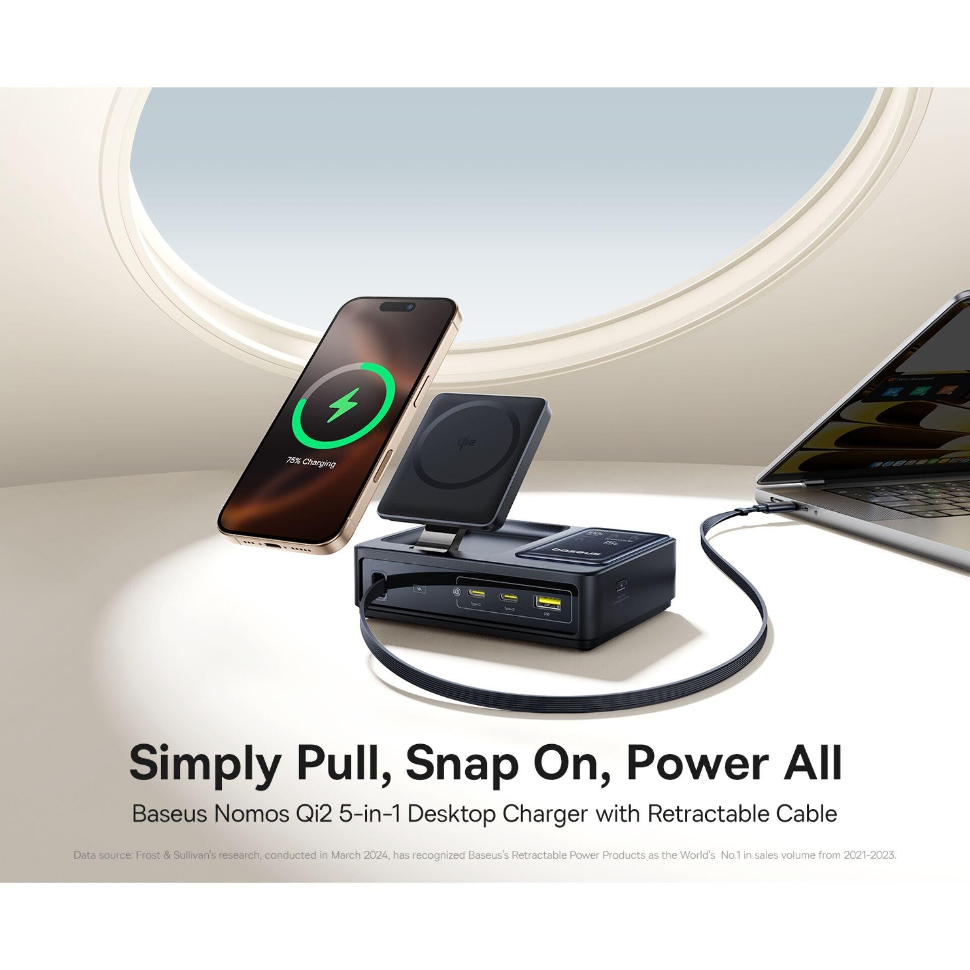 قم بتنظيم مساحة عملك مع منصة الشحن القوية Baseus Nomos 5-in-1. تم تصميم هذه المنصة المتكاملة بتقنية GaN (نيتريك الغاليوم) المتقدمة، مما يسمح لها بتوفير طاقة عالية السرعة بقدرة 140 واط في هيكل أنيق ومدمج. الميزة الأبرز هي كابل USB-C المدمج القابل للسحب، والذي يمتد عند الاستخدام وينكمش للحفاظ على مكتبك منظماً، مع دعم الشحن السريع PD 3.1 لأجهزة اللابتوب القوية مثل MacBook Pro.