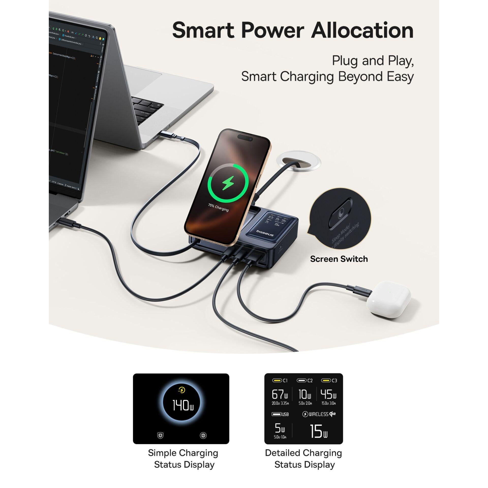 بالإضافة إلى الكابل المدمج، تتميز منصة Nomos بقاعدة شحن لاسلكي مغناطيسي بقدرة 15 واط تتوافق تماماً مع أجهزة آيفون. كما تتضمن منفذي USB-C إضافيين ومنفذ USB-A، مما يتيح لك شحن ما يصل إلى خمسة أجهزة في وقت واحد. ومع شاشتها الرقمية الذكية التي تعرض تحديثات الطاقة في الوقت الفعلي ونظام التحكم في الحرارة BCT من باسوس لضمان أقصى درجات الأمان، تعد هذه المنصة الخيار المثالي للمحترفين وعشاق التكنولوجيا.
