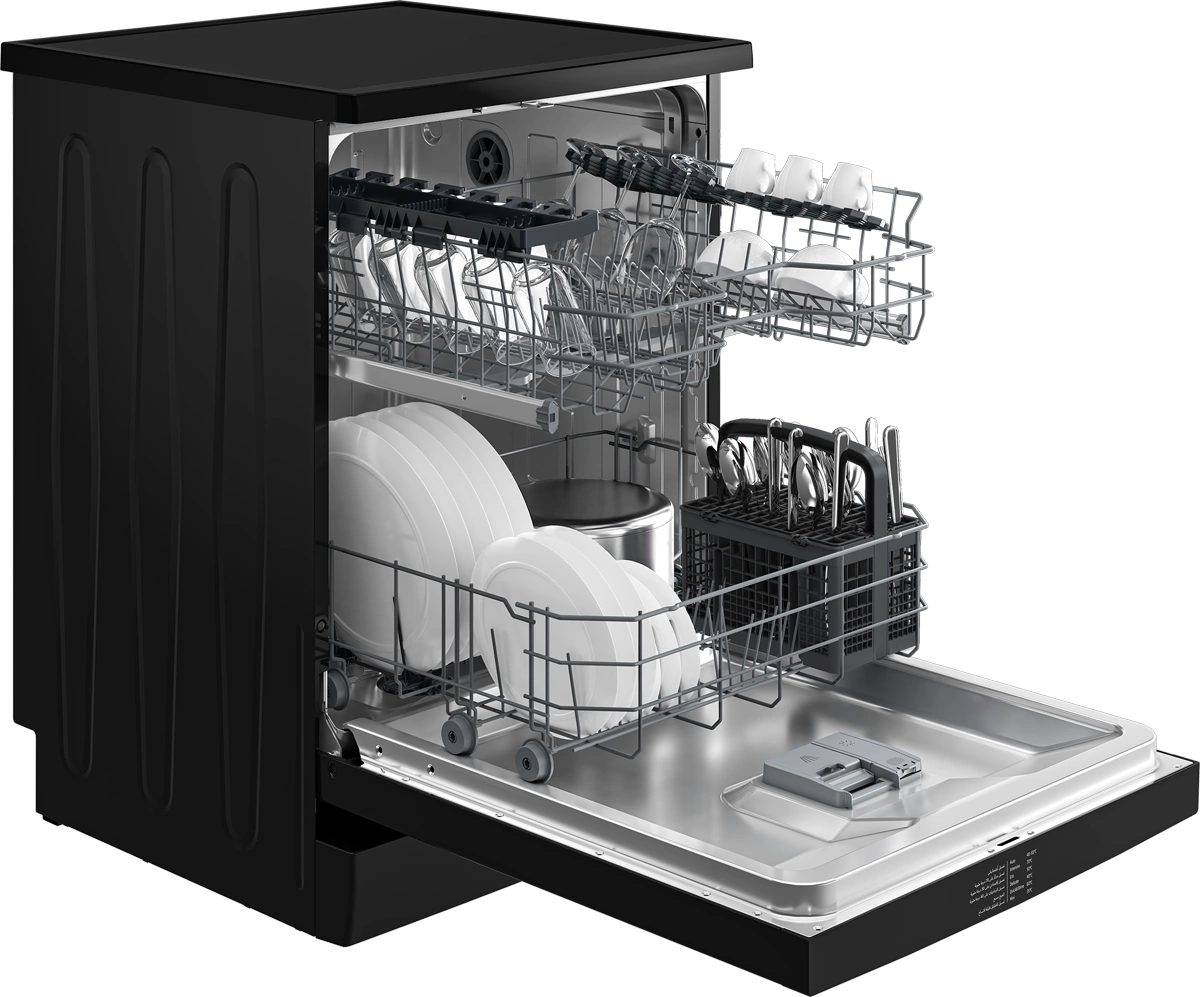 جلاية بيكو BDFN16422B بحجم كامل قائمة بذاتها، مصممة لاستيعاب حتى 14 طقمًا. تحتوي على 6 برامج غسيل متنوعة و3 مرشات مياه لضمان تنظيف شامل لمختلف أنواع الأطباق. تتميز بكفاءة طاقة A++ ومحرك إنفرتر لأداء موفر للطاقة وهادئ، مع لمسة نهائية سوداء أنيقة تناسب المطابخ الحديثة.