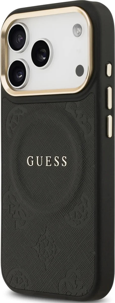 امنح سلسلة آيفون 17 لمسة من الأناقة الزهرية. يتميز كفر جيس (Guess) ماج سيف بنقشة "Peony" المطبوعة حرارياً على جلد PU فاخر، ليوفر مظهراً أسوداً فخماً لهواتف آيفون 17، 17 برو، و17 برو ماكس.