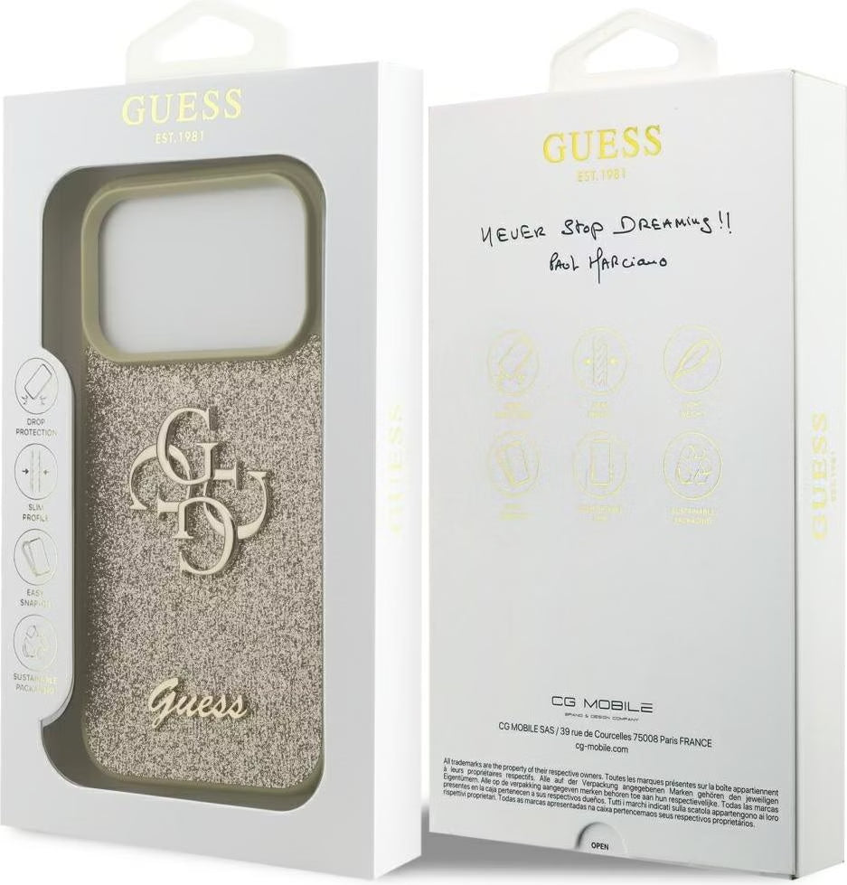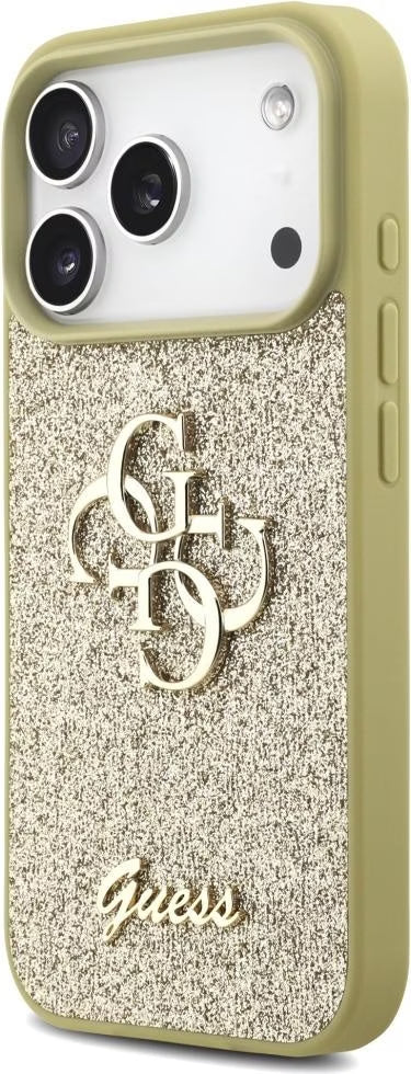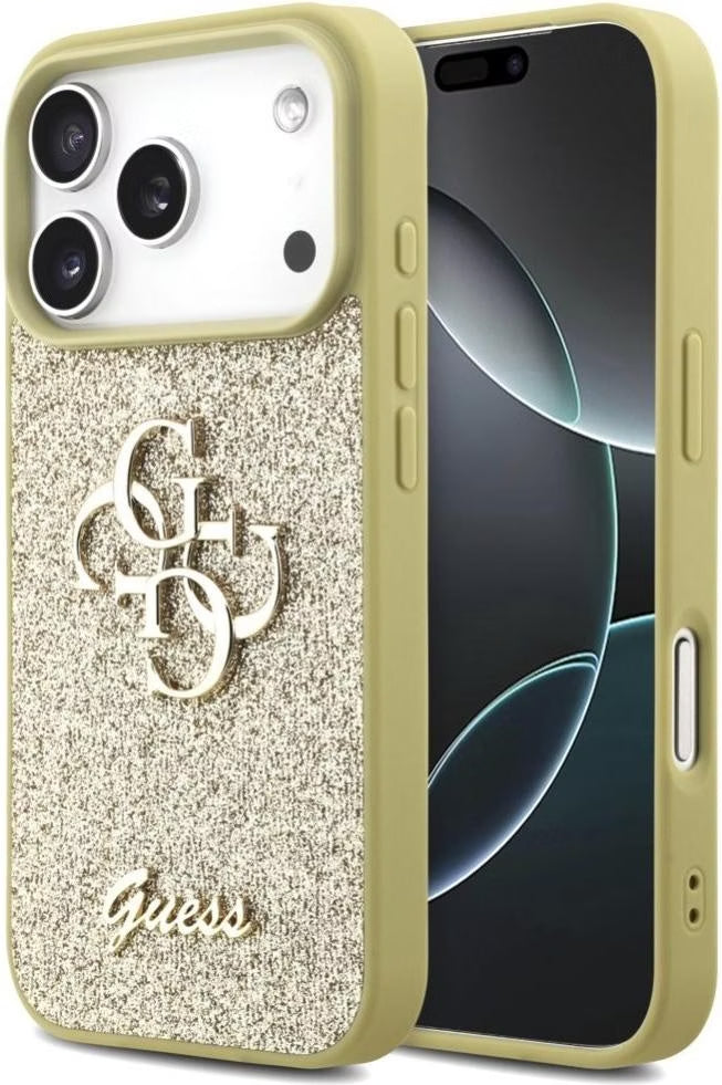 تألقي بفخامة وبريق لا يضاهى مع كفر جيس (Guess) باللون الذهبي. يتميز بلمسة غليتر مشعة وشعار 4G المعدني الكبير ليمنح آيفون 17 برو و17 برو ماكس إطلالة ملكية فاخرة.