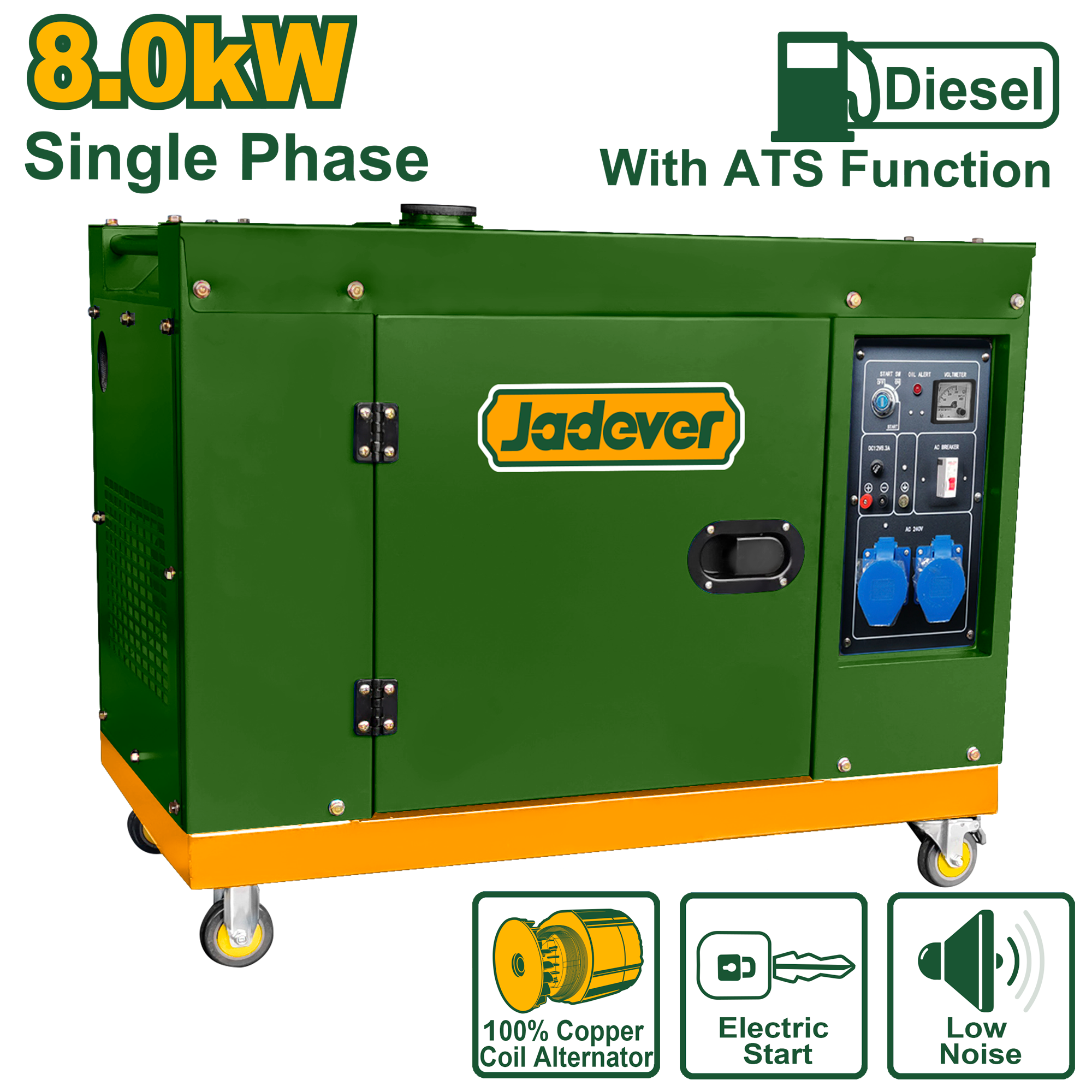 يوفر مولد Jadever الصامت بقوة 8.0 كيلو واط حلول طاقة متكاملة وذكية، حيث يتميز بنظام ATS الذي يضمن انتقالاً تلقائياً للطاقة عند انقطاع التيار، مما يجعله الخيار الأول للمنازل والشركات.