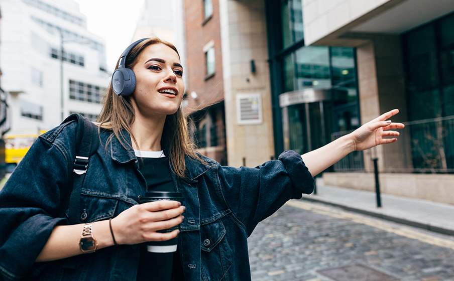 سماعة رأس لاسلكية بتصميم على الأذن توفر صوت JBL واضح مع عزل ضوضاء متكيف للاستخدام اليومي.