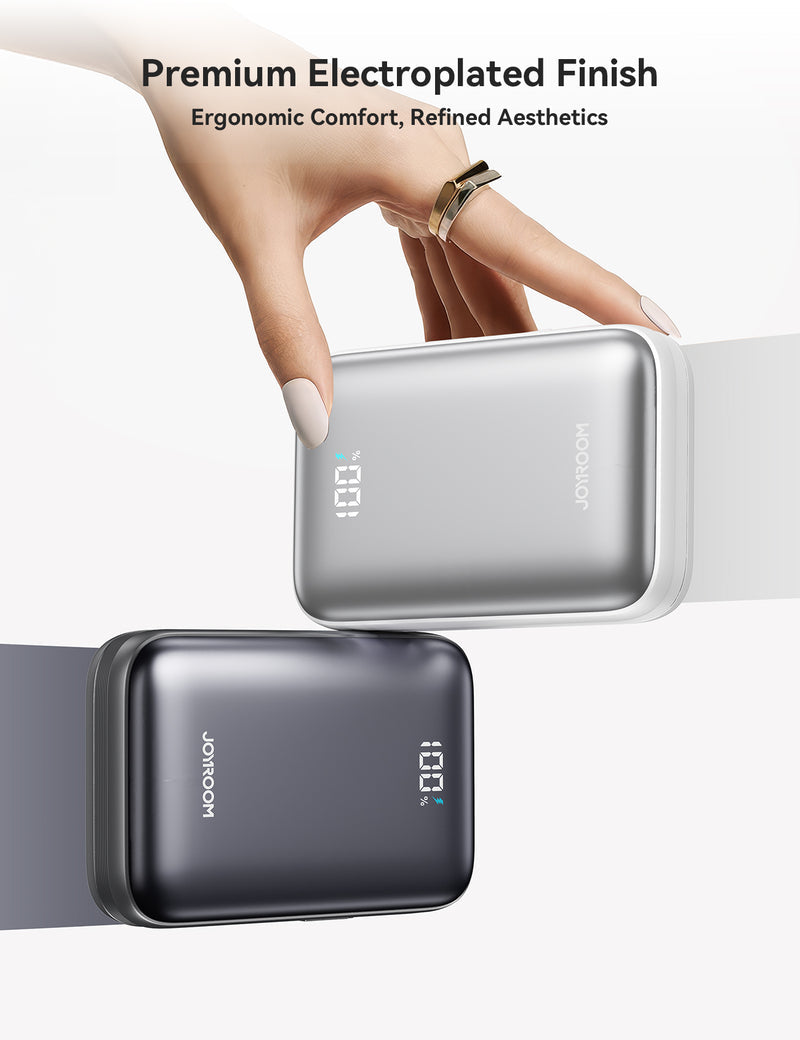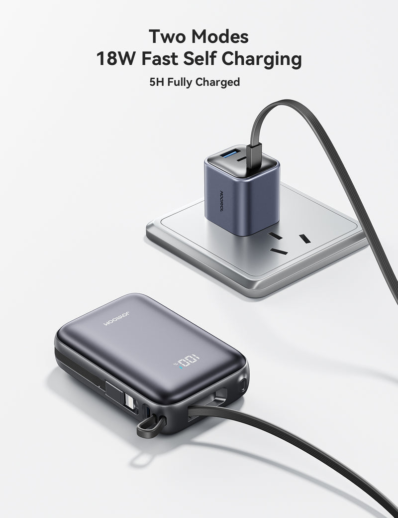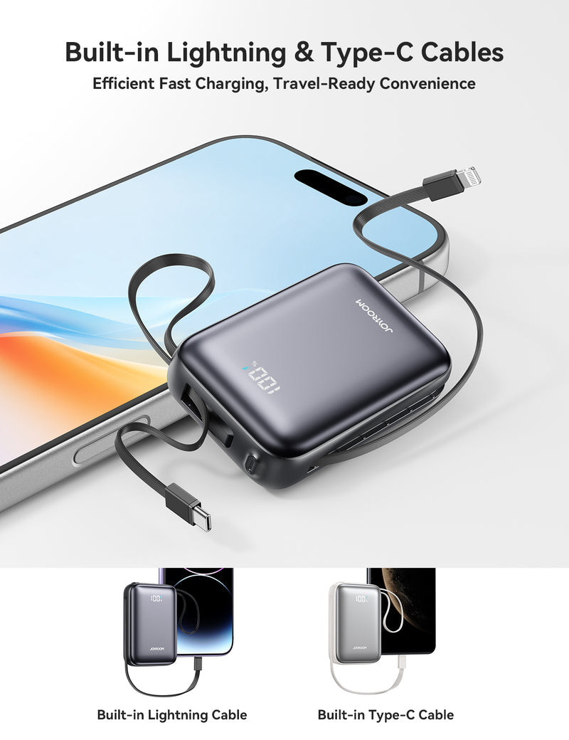 بنك طاقة جويروم JR-PBF29 بسعة 20,000 مللي أمبير، يتميز بشحن سريع بقدرة 22.5 واط وكابل USB-C مدمج لتجربة شحن مريحة دون الحاجة لكابلات إضافية.