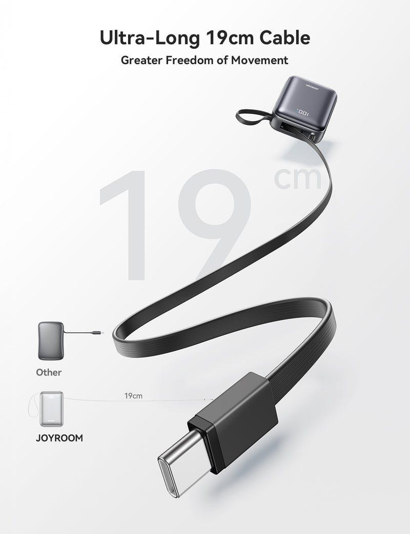 لا تقلق بشأن نفاذ البطارية بعد الآن مع Joyroom JR-PBF29. يوفر هذا الشاحن المدمج والقوي سعة هائلة تبلغ 20,000 مللي أمبير في تصميم ميني، مما يجعله مثاليًا للسفر والاستخدام المكثف. الميزة الأبرز هي كابل USB-C المدمج، الذي يتيح لك شحن أجهزتك فورًا دون الحاجة لحمل أسلاك إضافية، كما يعمل الكابل كعلاقة متينة لسهولة الحمل.
