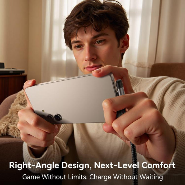 تعتبر سلسلة جوي رووم S-A56 الحل الأمثل لمحبي الألعاب ومستخدمي الهواتف المكثفين. يتميز بتصميم فريد بزاوية 90 درجة، حيث يثبت الموصل بشكل مسطح على جهازك، مما يمنع الكابل من إعاقة يدك أثناء اللعب أو مشاهدة الفيديو في الوضع الأفقي. هذا التصميم المريح يقلل أيضاً بشكل كبير من ضغط الانحناء على الكابل، مما يطيل عمره الافتراضي.