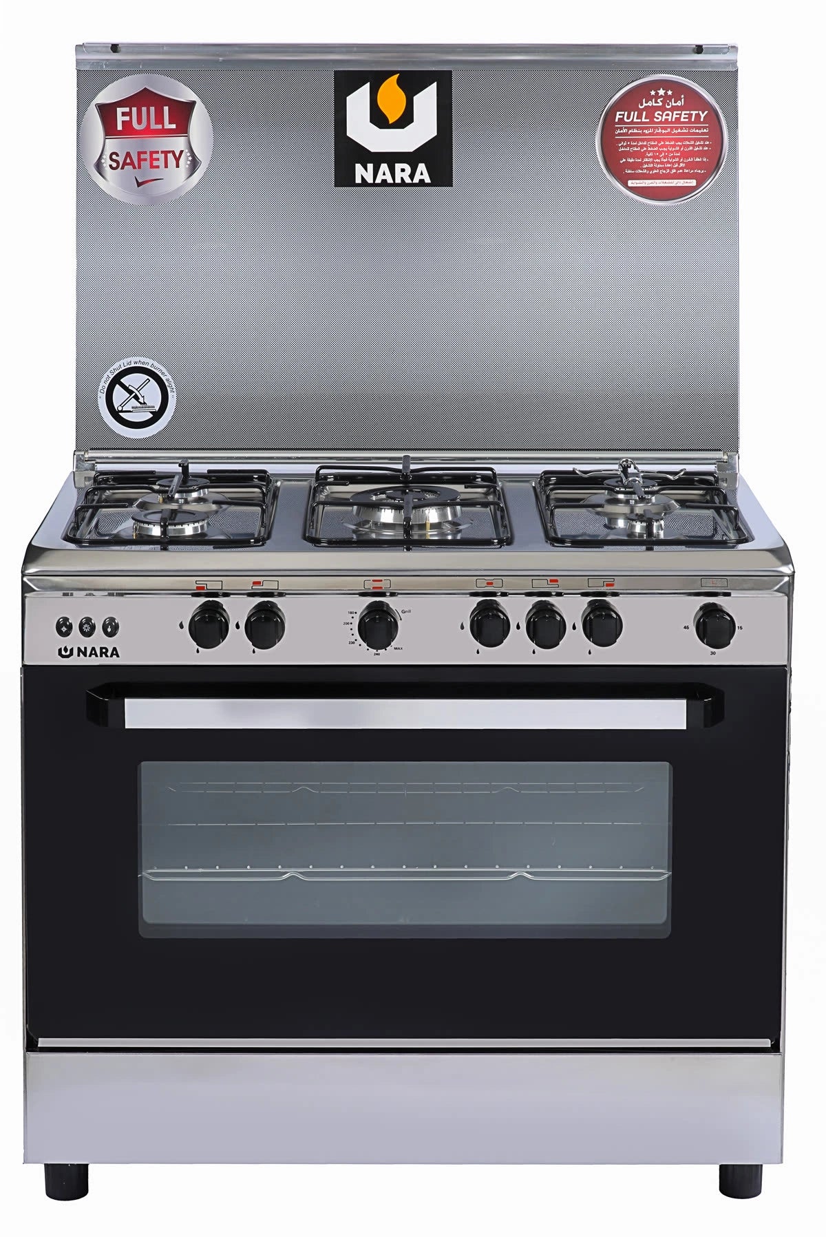طباخ غاز نارا بأمان كامل، لمسة فضية، وتفاصيل زجاجية سوداء، مثالي للطهاة المنزليين.