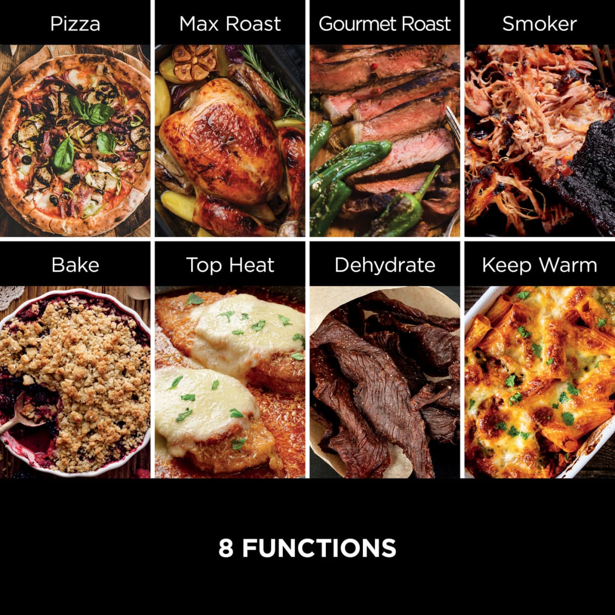 8 وظائف طهي: بيتزا، ماكس روست، جورو ميه روست، حرارة علوية، خبز، تدخين، تجفيف، وإبقاء دافئ.