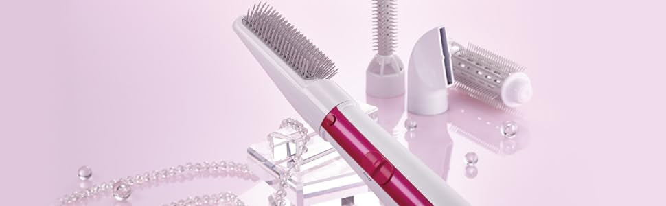 يأتي هذا الموديل كمجموعة متكاملة مع **أربعة ملحقات احترافية**: فرشاة النفخ للتمليس، وفرشاة دوارة لعمل تموجات جميلة، وفرشاة دوارة رفيعة للخصل الأصغر، وملحق رفع الكثافة (Volume Lifter) لمنح جذور الشعر مظهراً حيوياً وكثيفاً. يضمن المحرك بقوة **650 واط** تجفيفاً وتصفيفاً فعالاً مع كونه لطيفاً على خصلات شعرك.