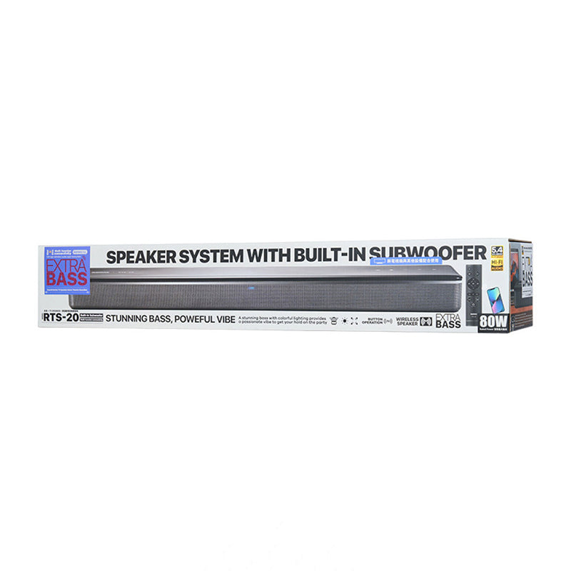 تقدم سماعة Remax RTS-20 اللاسلكية لمسرح منزلي صوتًا قويًا وغامرًا بفضل قوة إخراج تصل إلى 80W وتأثيرات إضاءة RGB المدمجة. تم تصميمها لتحسين تجربة الصوت على التلفزيون، الألعاب، والموسيقى مع دعم الاتصال اللاسلكي عبر Bluetooth لبث الصوت من الهواتف الذكية والأجهزة اللوحية وغيرها.